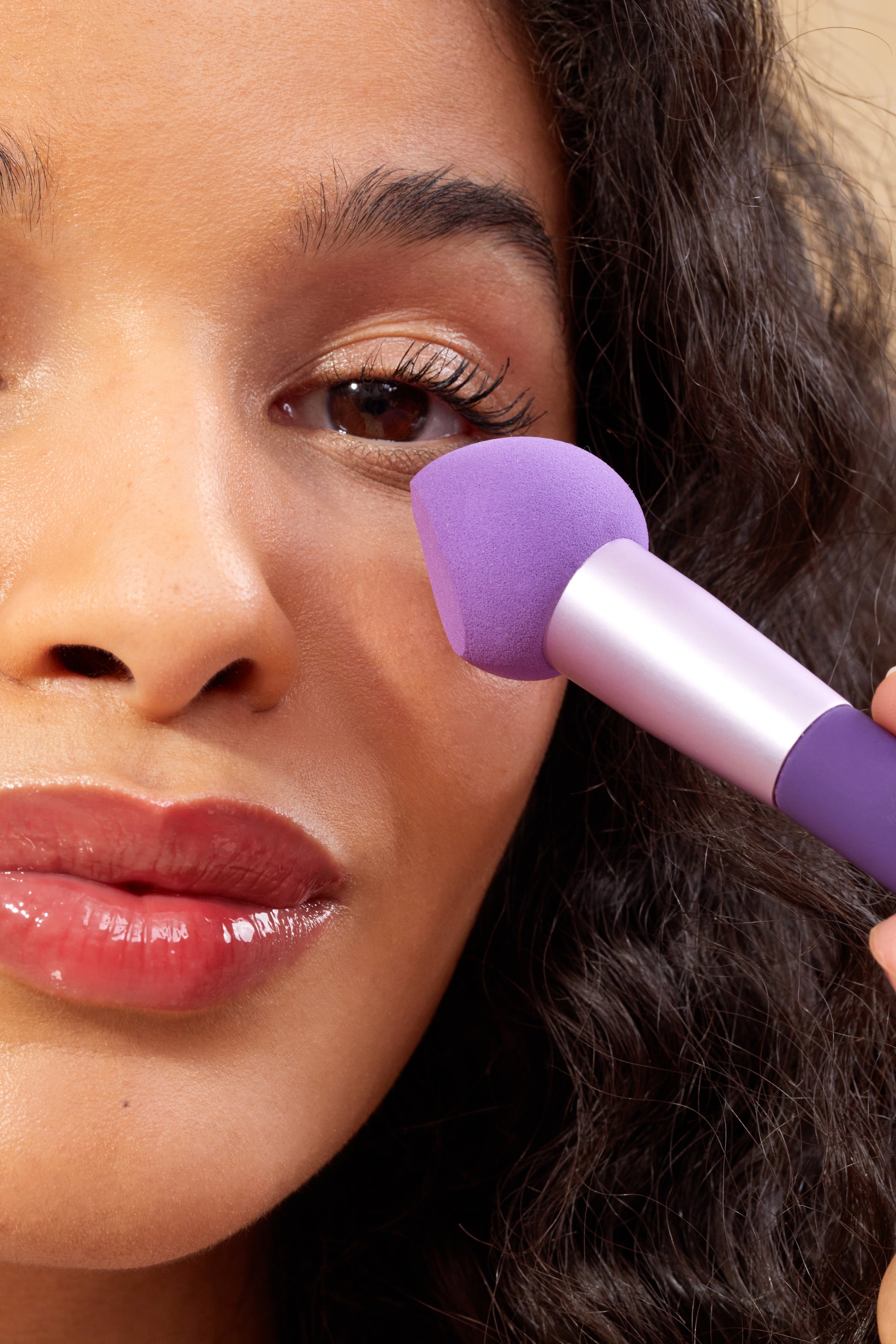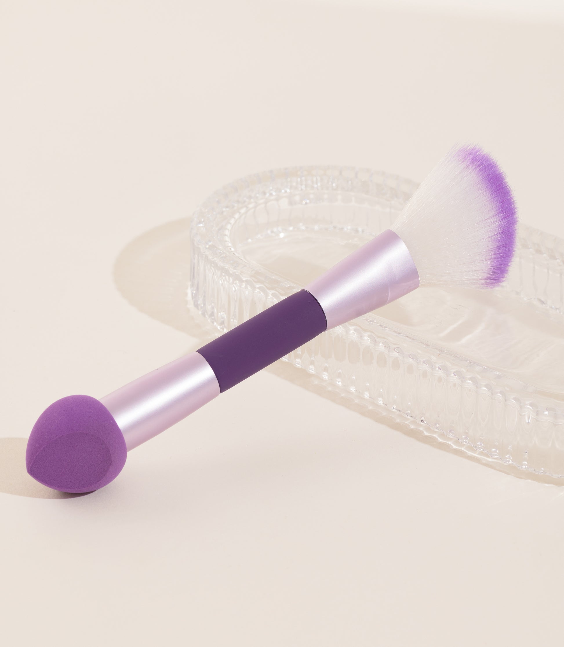 両端に異なる形状のビューティーツールが付属した、ダブルエンドブラシ。リキッドやクリーミーなコスメに適したスポンジと、パウダー状のコスメに適したブラシが、2in1で便利な美容ツールです。